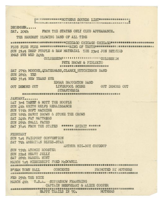 An original concert handbill for various performances at the Town Hall, Birmingham in December 1969, January, February and March 1970. Listed to perform are: