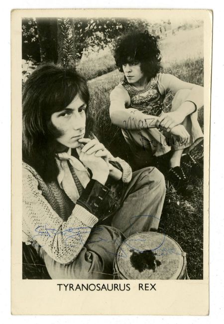 An original vintage seventies black and white promotional photograph of Tyrannosaurus Rex which has been signed by the duo on the front. Marc Bolan has signed in black ballpoint pen and Steve Peregrin Took has signed in blue ballpoint pen. Marc has also handwritten a letter on the reverse. It reads: