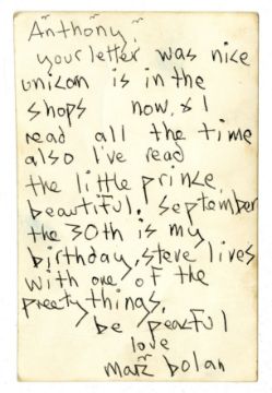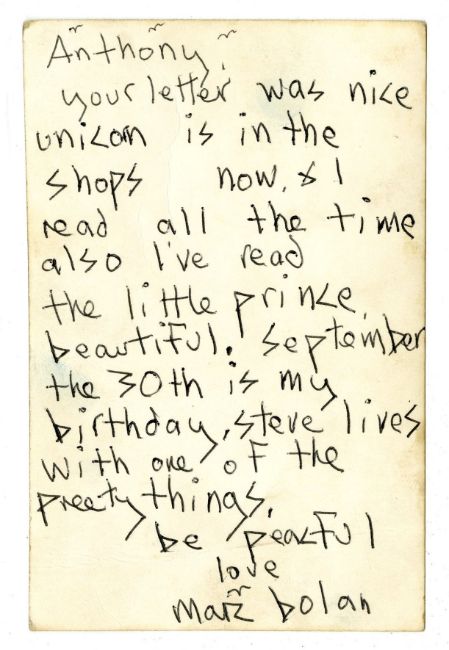 Your letter was nice Unicorn is in the shops now & I read all the time also I've read the little prince, beautiful. September 30th is my birthday, Steve lives with one of the Preety [sic] things.