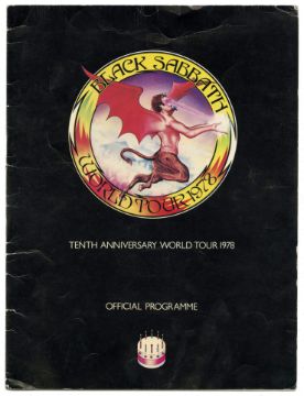 An original programme for the Black Sabbath 1978 Never Say Die! tour. It has been signed by the group on the inside pages. Bill Ward has signed in black marker pen adding 'DRUMS' after his name with a cross, Tony Iommi and Ozzy Osbourne have autographed in black ballpoint pen and Geezer Butler has signed in blue ballpoint pen adding 'love' before his name.