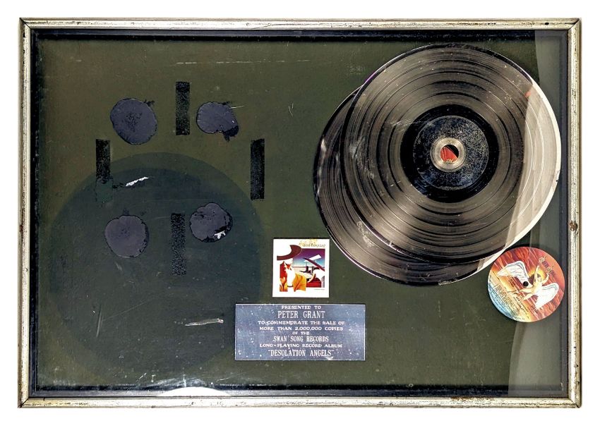 An original silver disc award for the Bad Company 1979 album ‘Desolation Angels’. It was presented to Peter Grant and is to commemorate the sale of more than 2,000,000 copies of the Swan Song Records album.