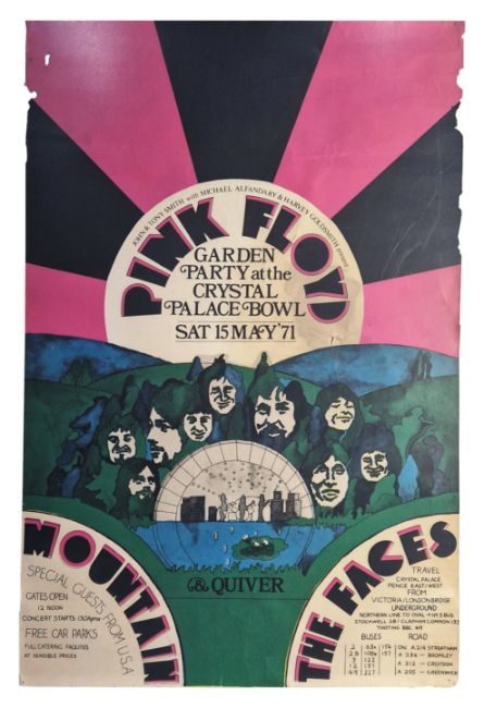 An original poster for the Pink Floyd performance at the Garden Party at the Crystal Palace Bowl on the 15th May 1971.