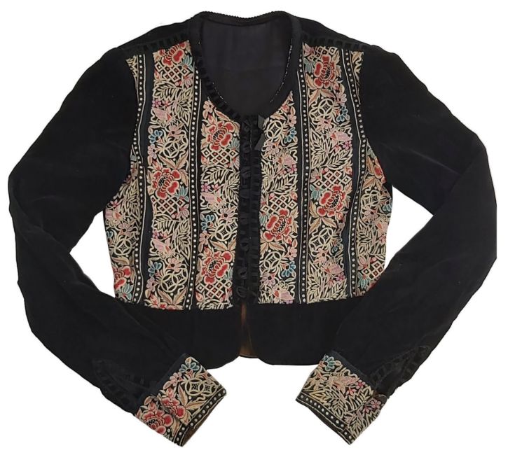 A jacket previously owned by Marc Bolan. Marc wore the garment in various photo shoots and on stage. It features black velvet sleeves with embroidered front panels and a black satin lining.