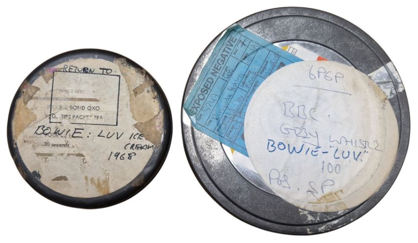 A pair of original film reels containing the advert David Bowie filmed made to promote the Luv ice lolly in 1969. The 35mm negative reels are housed in two cannisters each bearing stickers and handwritten notes with the contents. The advert can be seen here.