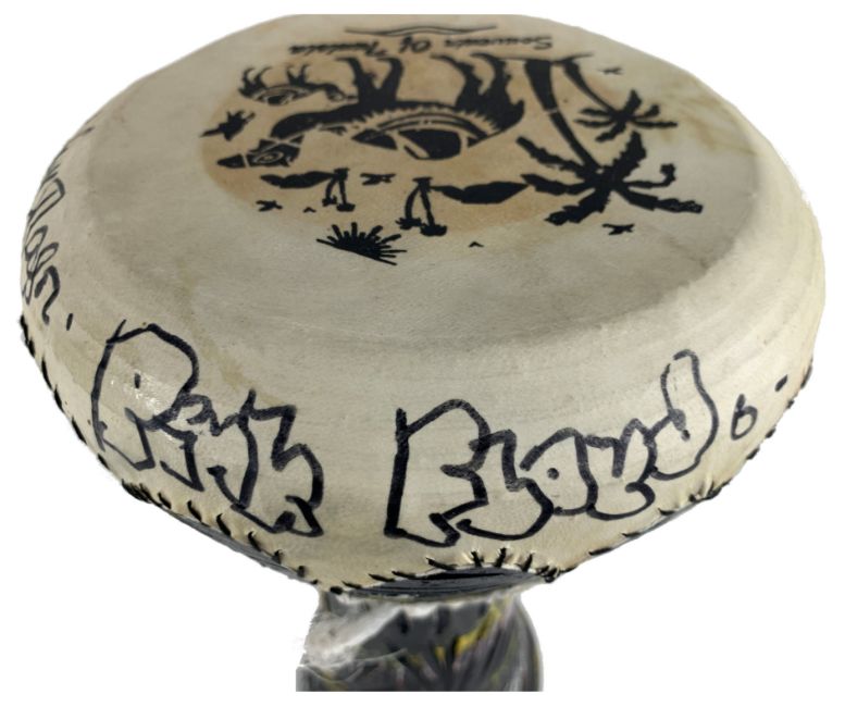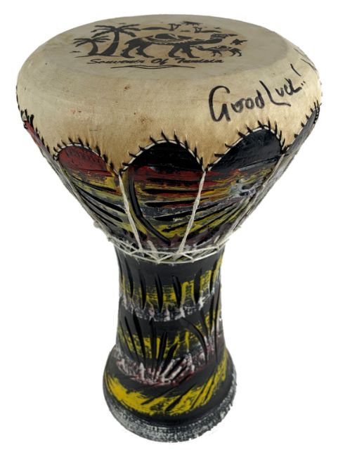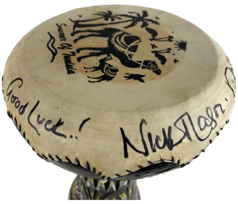 A souvenir bongo drum from Tunisia that has been signed on the top by Pink Floyd drummer Nick Mason. Nick has signed in black pen and has added ‘Good Luck’ and ‘Pink Floyd’ before and after his autograph, respectively.