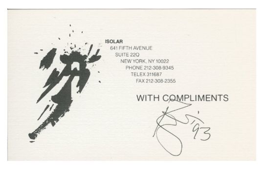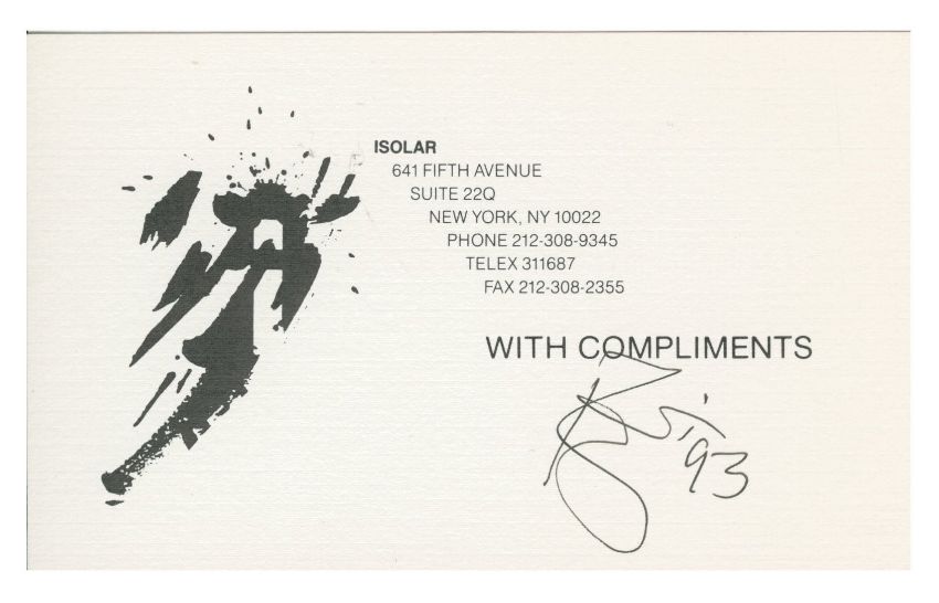 An original Isolar Enterprises Inc. compliments card which has been autographed by David Bowie in black pen. Isolar was the name of the company Bowie formed to handle his music publishing. David has added the year ‘93’ to the right of his signature.