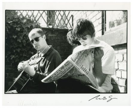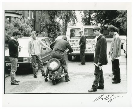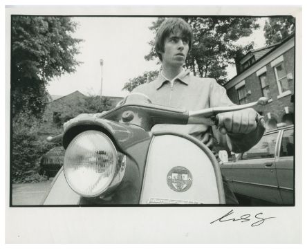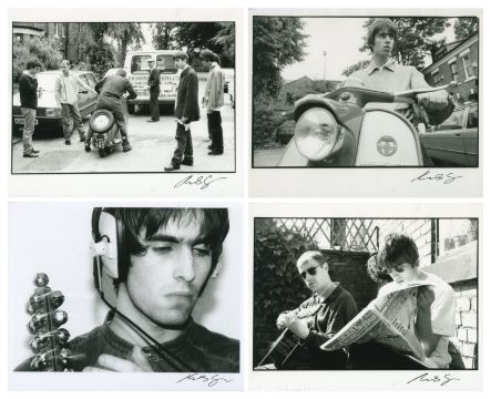 A collection of four black and white photographs of Oasis taken by Michael Spencer Jones. Includes the following photos: Liam Gallagher during a recording session at Out of The Blue Studios, Manchester in 1993 Liam and Paul ‘Bonehead’ Arthurs sat in a garden Noel sat on a Lambretta moped in 1995 The group surrounding a Lambretta moped in 1995 Michael has signed each of the prints in the bottom right corner in black pen. There are copyright stamps on the reverse.