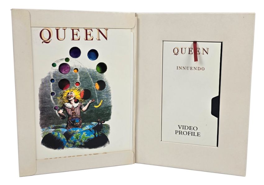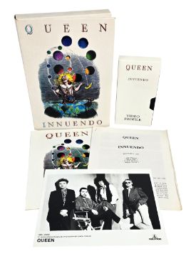 An original UK promotional press kit for the 1991 album Innuendo by Queen. The kit consists of a VHS tape with a video profile of the group, a card sleeve bearing the album artwork, five printed sheets of information stapled together which contain a biography of the group and their discography and a black and white Parlophone promotional photograph. The contents are housed in a white box bearing the Innuendo album artwork.