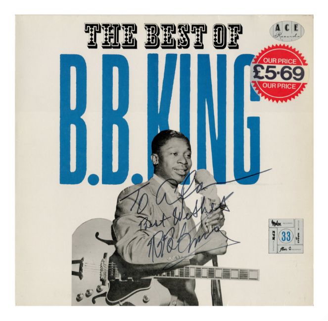 A UK pressing of the 1980 compilation album entitled ‘The Best Of B.B King’ which has been autographed by B. B. King. He has signed his full name in black pen on the front of the LP sleeve and added ‘To Allan Best Wishes’ above his signature. The record is on the ACE Records label with catalogue number CH 30.