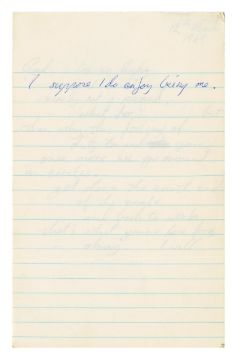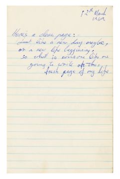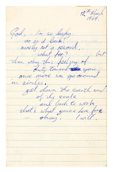 Three sheets of lined paper on which Peter Green, former guitarist with Fleetwood Mac, has handwritten notes in blue ink. The first two pages are dated the 12th March 1969. In 1969, Green was still part of Fleetwood Mac and recorded his final album with the group 'Then Play On' before his departure in 1970. The single 'Man of the World' was released in 1969, the lyrics of which sparked worry in his bandmates as they noticed a change in his state of mind. In late March 1970 at a commune in Munich, Green's drink was spiked with LSD, this incident is cited as a crucial point in Green's mental decline and subsequent departure from Fleetwood Mac.