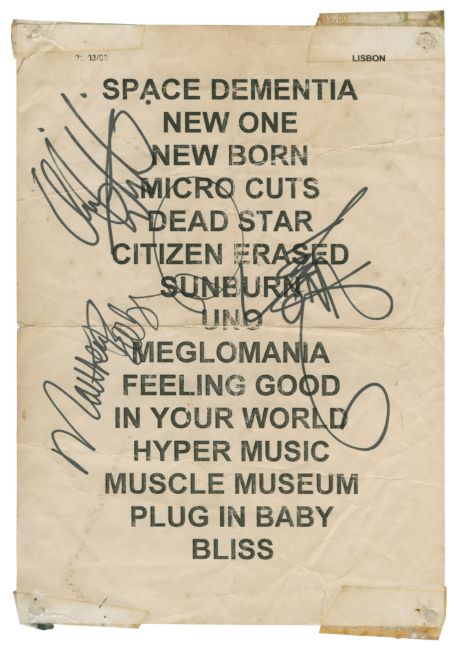 A typed set list for the Muse performance at the Aula Magna, Lisbon on the 21st April 2002. The concert was originally planned for the 9th March but was postponed. Matt Bellamy, Chris Wolstenholme and Dominic Howard have each signed in black marker pen.