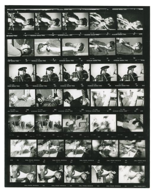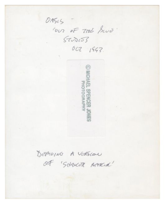 A contact sheet bearing 35 images of Oasis taken during a studio session for the demo of ‘Shakermaker’. The images were taken by Michael Spencer Jones at ‘Out of The Blue Studios’, Manchester in October 1993. Michael has made several notes in black ink on the reverse and there is also a copyright sticker on the reverse.