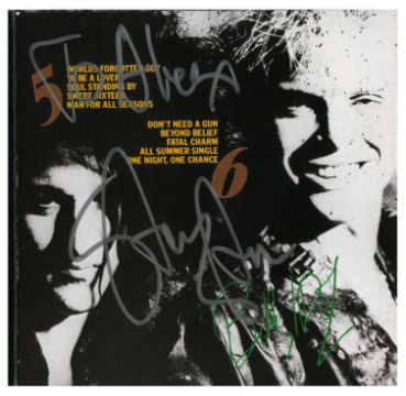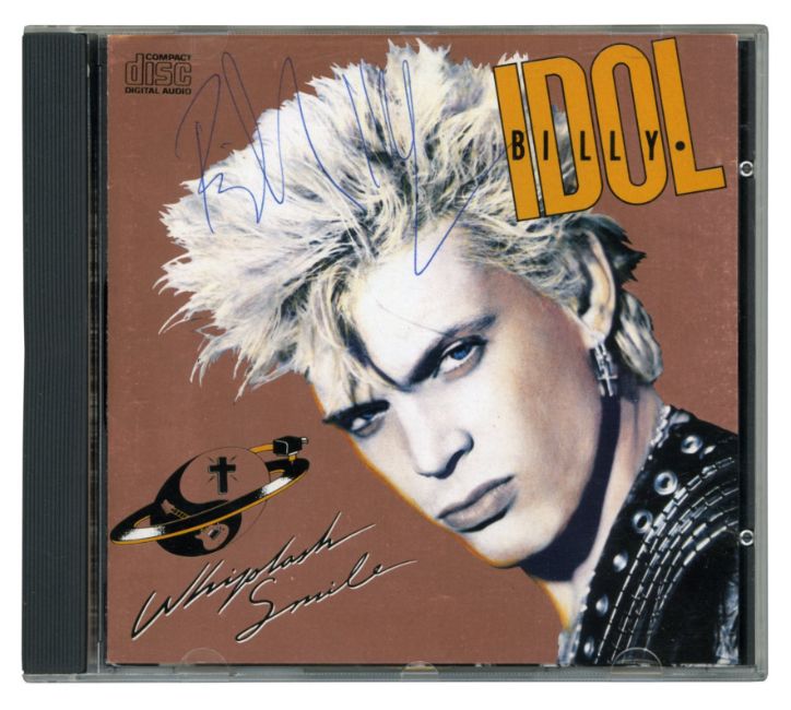 A CD copy of Billy Idol’s 1986 album ‘Whiplash Smile’. The booklet has been signed on the front cover by Billy in blue ballpoint pen. Billy’s guitarist, Steve Stevens, has autographed inside in silver marker pen adding ‘To Alex’ above his name.