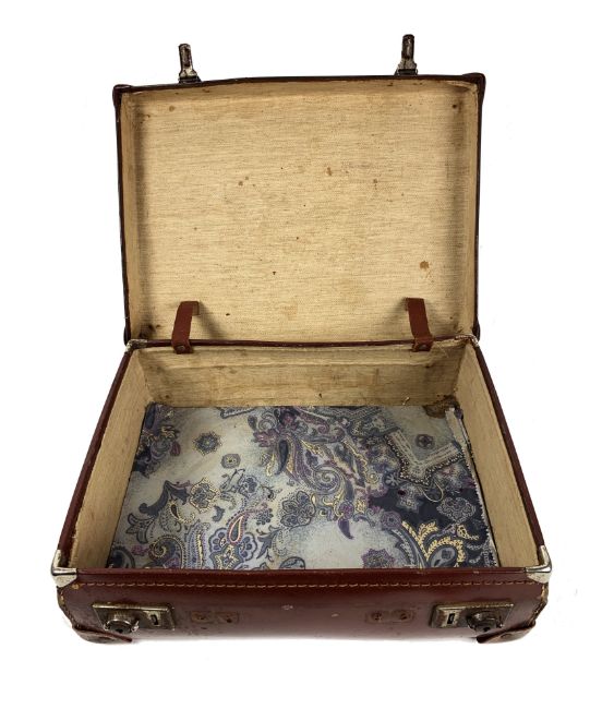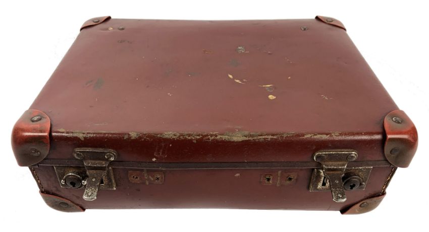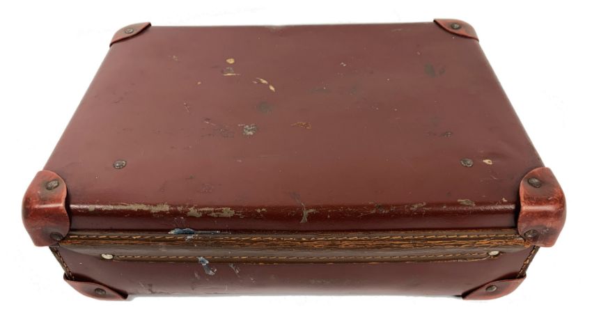 The case measures 35.5cm x 25.5cm x 12cm (14 inches x 10 inches x 4.5 inches). The handle is missing from the case and there are signs of wear and scuffing. The condition is very good minus.