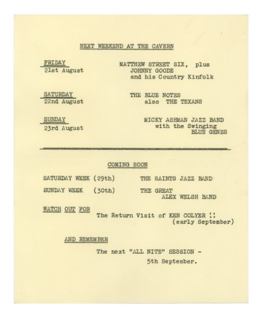 An original fifties handbill for The Texans performance at the Cavern Club, Liverpool on 22nd August 1959, Ringo Starr was the drummer in the group.