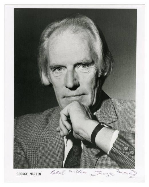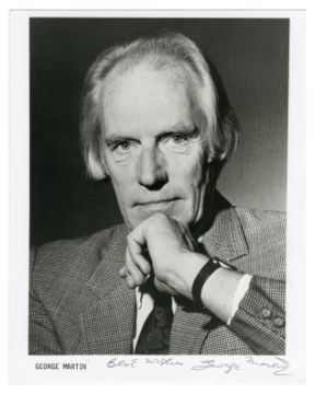 An original black and white promotional photograph of Sir George Martin that has been signed on the front in black pen by Sir George. He has also added the inscription ‘Best Wishes’ to the left of his signature.