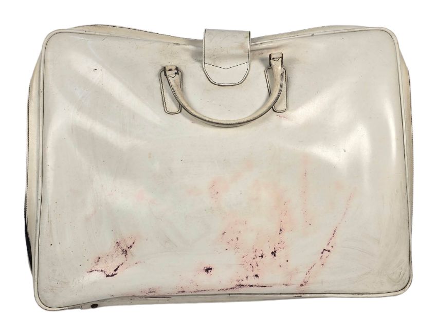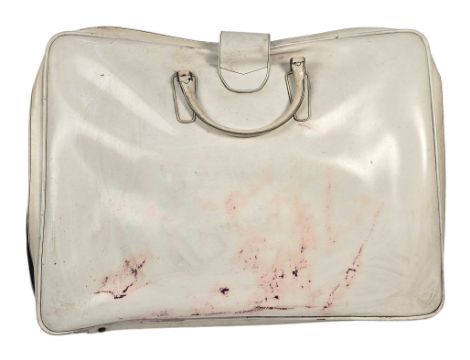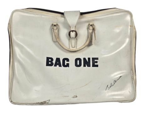 A plastic portfolio bag that was used to house John Lennon’s 1969 Bag One series of numbered lithographs, only 300 sets of these were made. Each lithograph was signed by John Lennon. The series of drawings was first published under the title Bag One and exhibited in January, 1970 at the London Art Gallery. On its second day of viewing, the exhibition was closed by Scotland Yard and the lithographs were confiscated because of their highly intimate and erotic nature. The case was ultimately dismissed when the magistrate decided that John's prints were ‘Unlikely to deprave or corrupt’. The portfolio still contains the original card inners which are normally removed and the original name tag is still present.