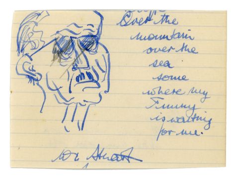 A small piece of lined paper containing a drawing by Stuart Sutcliffe of a man in sunglasses. The drawing is in blue ink. Next to the drawing Stuart has handwritten the following: