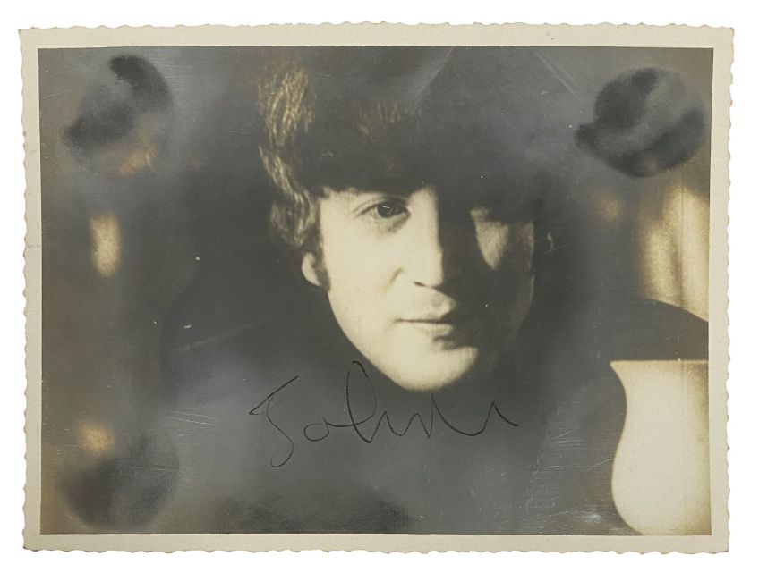 A black and white photograph of John Lennon which has been signed by John in first name only in black ballpoint pen. The signature dates to circa 1967.