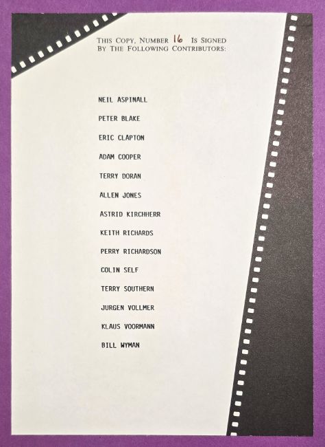 This is an extremely low numbered copy, no. 16 of 5000 limited edition copies and has been hand signed by Neil Aspinall, Peter Blake, Eric Clapton, Adam Cooper, Terry Doran, Allen Jones, Astrid Kirchherr, Keith Richards, Perry Richardson, Colin Self, Terry Southern, Jurgen Vollmer, Klaus Voormann and Bill Wyman. Contains the best collection of signatures that we have seen compiled by Genesis for this publication.
