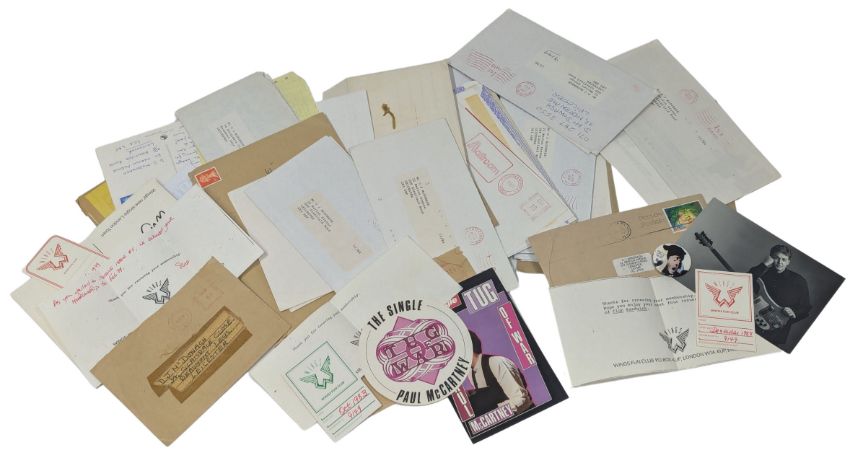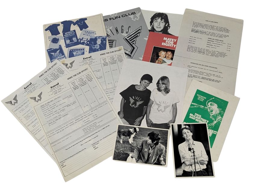 An extremely comprehensive collection of material from the Wings Fun Club and the Paul McCartney Fun Club. It consists of over 40 date stamped envelopes and correspondence from 1978-1998 from the Paul McCartney Fun Club sent to one member. The envelopes contain numerous black and white and colour promo cards, fan club membership cards and renewal forms, invitations to TV programme filmings, video shoots and concert rehearsals, complimentary slips signed by fan club secretary Sue Kavanagh, promotional letters for Paul McCartney, record and video releases etc., concert ticket offers, Buddy Holly Week publicity material etc. There are also numerous unfolded fun club merchandise offers and sales sheets including early ones from the late 70s and early 80s.