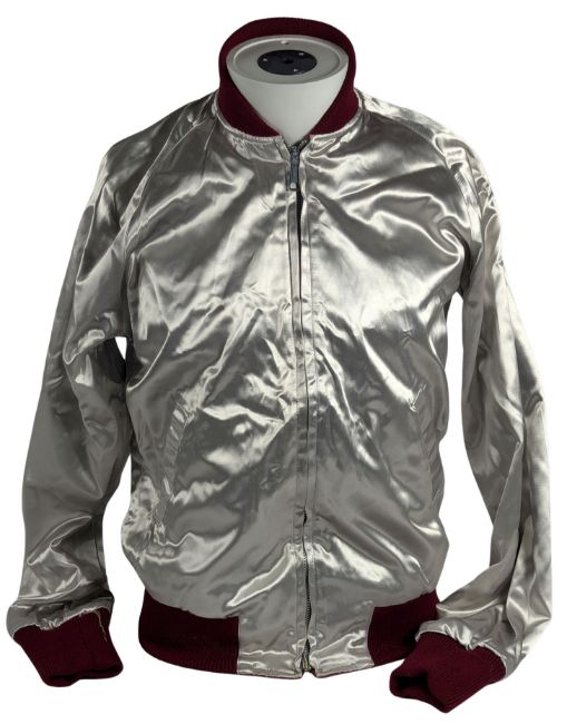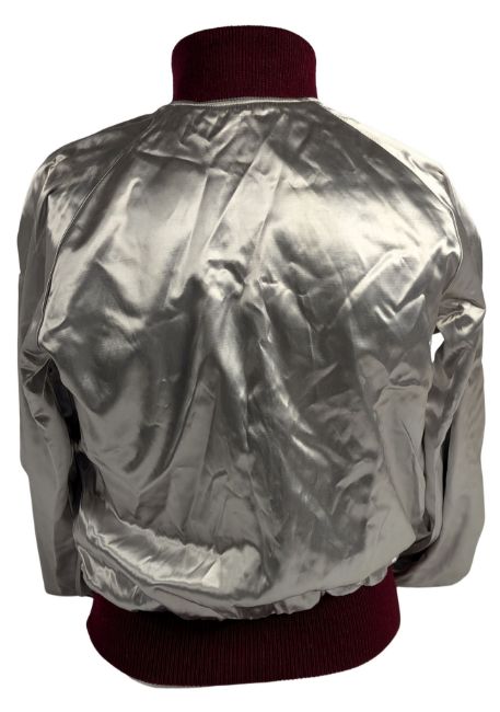 A red and silver reversible satin bomber jacket that previously belonged to Geoff Emerick. America, the name of the USA soft rock group that Geoff worked with in the post-Beatles part of his career, is embroidered across the front of the red side in blue and white. There is a Magic Land Of Ubilam label stitched to the inside of the left pocket and the name ‘Geoff’ embroidered in red on the inside of the right pocket. The jacket is reversible and can also be worn as a plain silver jacket with red cuffs.