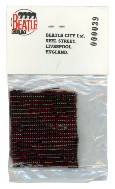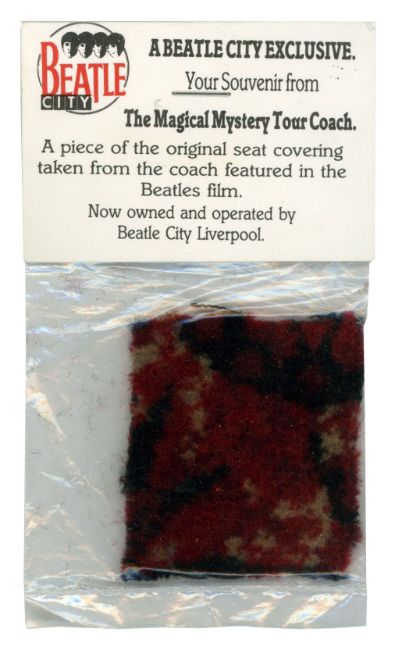 An original swatch of fabric from The Beatles Magical Mystery Tour coach. The coach was purchased by Radio City, Liverpool who also owned the Beatle City Museum. They re-upholstered some of the seats and this original material was cut into small swatches and then sold by the museum. The swatch is housed in a plastic bag with card tag which bears the Beatle City logo.