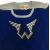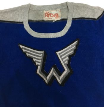 Henry McCullough’s 1972 Ritva Man blue knitted t-shirt which was worn extensively during Paul McCartney and Wings UK university tour between 9th and 23rd February 1972 and also on the group’s European tour between 9th July and 24th August 1972. The t-shirt bears the Wings logo on the front. Paul McCartney commissioned the shirts to be made by the English design collective Ritva Man. The Ritva Man label was formed in 1969 by Ritva Ross and her husband Mike Ross and the clothing from the label remains highly collectible to this day. The Ritva Man label is present.