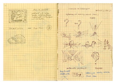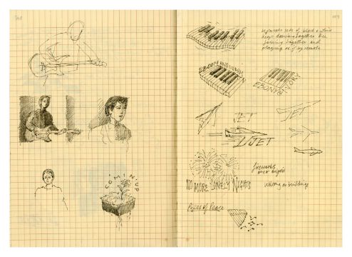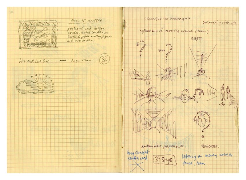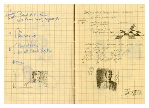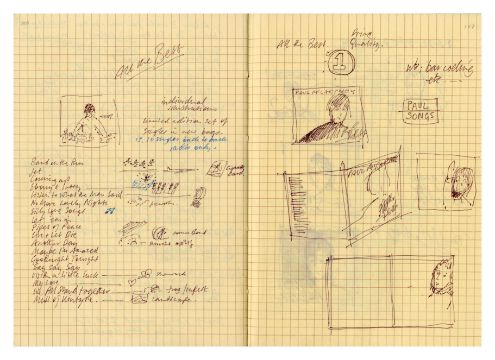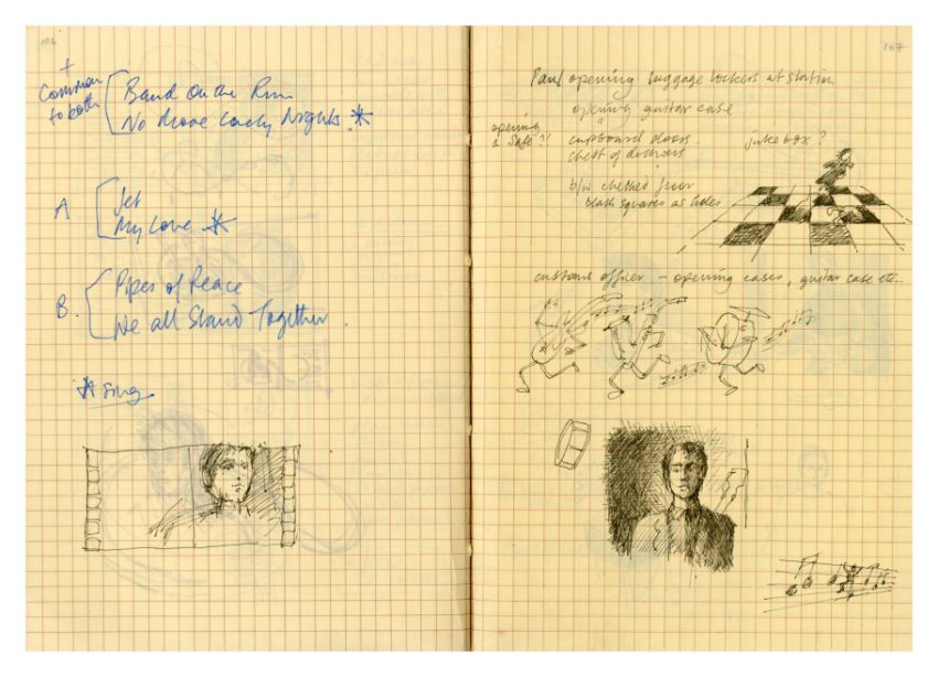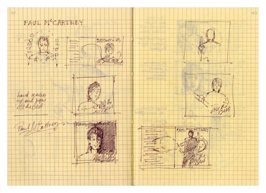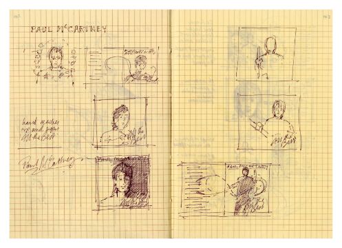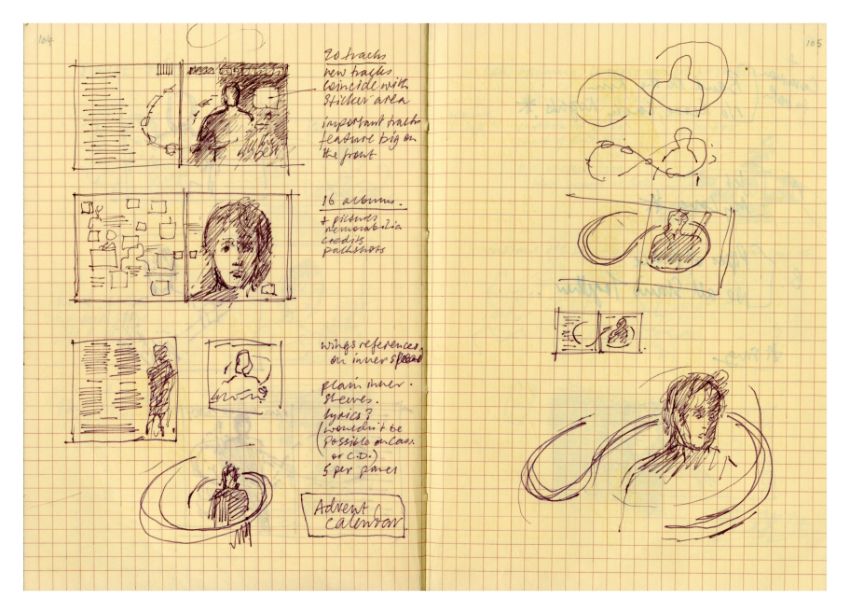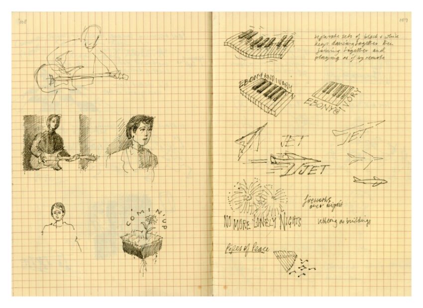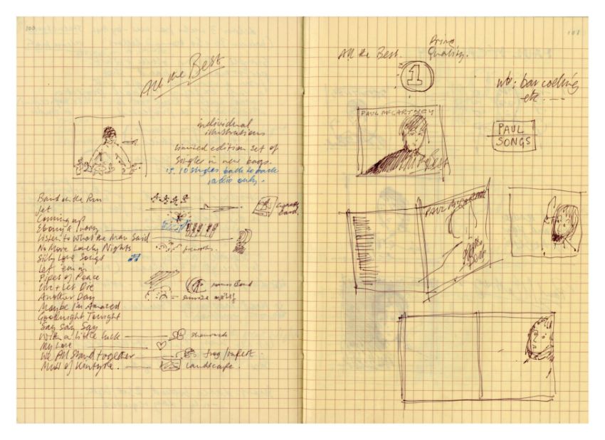 A notebook that previously belonged to designer Mike Ross which contains drawings for albums covers, logos and various other designs and ideas. Mike was commissioned by Paul McCartney to design the cover for his compilation album 'All The Best'. The notebook contains 11 pages of concept notes, drawings, sketches, song titles etc. all relating to the design for the 'All The Best' album. It also includes designs for the following albums 'React' by The Fixx, 'How We Live' by Dry Land and 'Weapons Of Love' by The Truth.