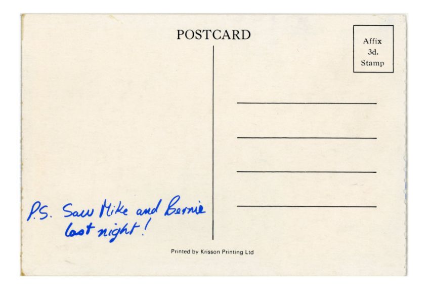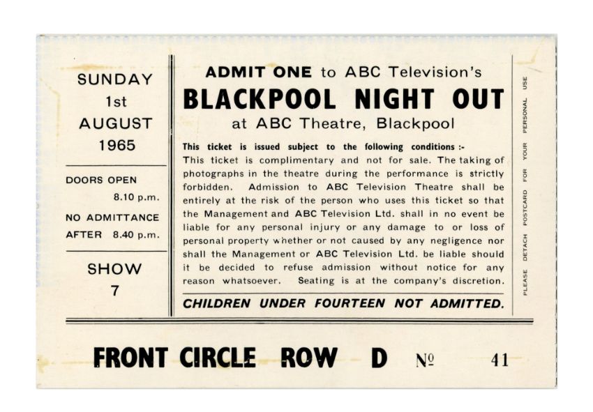 An unused gatefold double sided card stock ticket for The Beatles appearance on the British ITV television programme Blackpool Night Out that took place at the A.B.C. Theatre, Blackpool, Lancashire, England on 1st August 1965. FRONT CIRCLE. ROW D. Seat 41. A colour postcard printed with the words ‘Greetings From Blackpool Night Out’ forms part of this gatefold ticket.