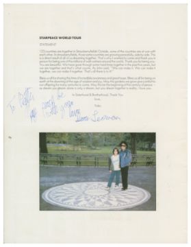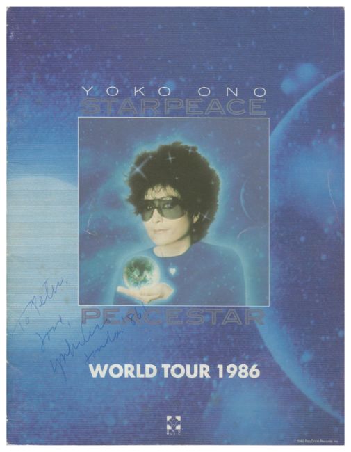 An original programme for the Yoko Ono Starpeace 1986 World Tour which has been signed by Yoko on the front cover. Yoko has signed in blue ink adding 'To Peter, love' above her name and 'London '86!'. John and Yoko's son Sean has also signed inside the front cover adding 'To Peter, May peace be with you love' above his name. The signatures were obtained after the Starpeace World Tour concert in Wembley.