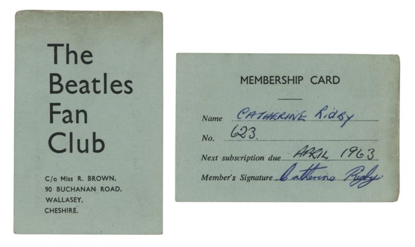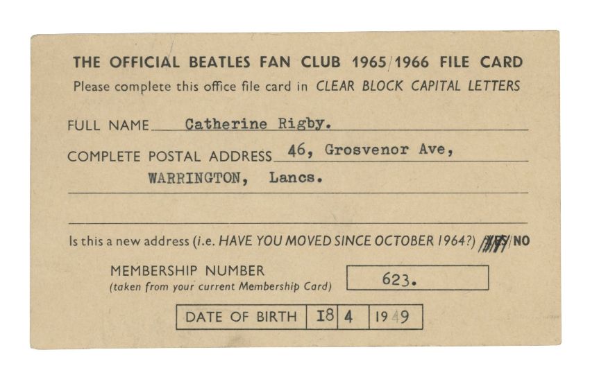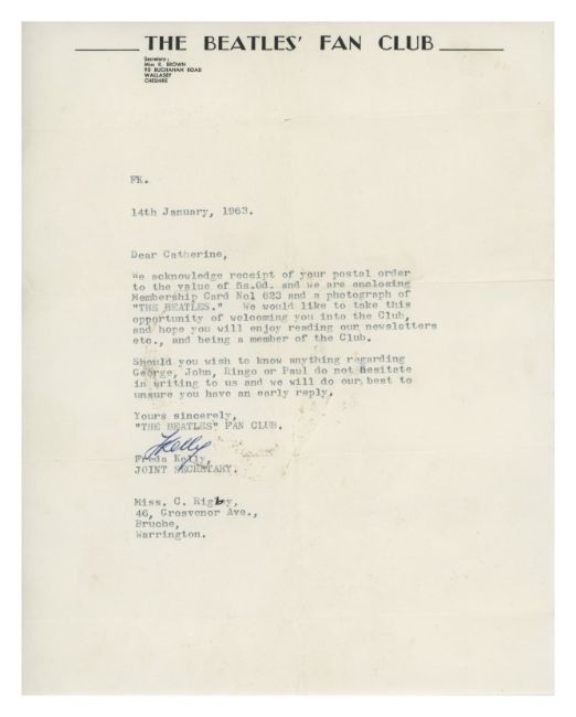 An original letter and membership card from The Beatles Fan Club. The letter is dated 14th January 1963 and is welcoming the recipient to the fan club. It has been signed in blue pen by Freda Kelly. The membership card bears the 90 Buchanan Road address and all the relevant details have been filled in on the reverse. Also included is a Beatles Fan Club 1965/1966 File Card bearing member’s details.