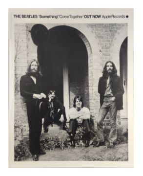 An original sixties Apple Records promotional poster for the release of the Beatles single ‘Something’. The poster depicts an image of the group taken by Ethan Russell on 22nd August 1969 at John Lennon’s Tittenhurst Park home. The was to be the final Beatles photo shoot. The words ‘The Beatles Something Come Together Out Now Apple Records’ are printed above the image.
