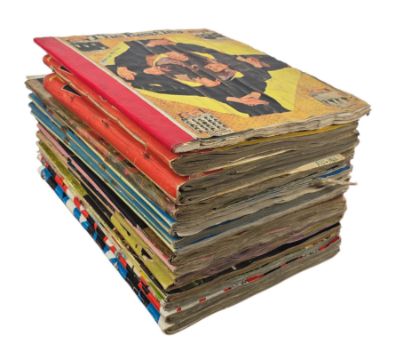 The largest scrapbook measures 25.5cm x 36cm (10 inches x 14.1 inches). There is some wear to the covers and edges of the pages, some have tape down the sides. Some cuttings may have come loose on the inside pages. The overall condition of the collection is very good.