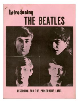 A vintage sixties press kit that was issued for the 1962 release of The Beatles single ‘Love Me Do’. The front cover comprises a head and shoulders image of each band member with the printed words ‘Introducing The Beatles’ and ‘Recording For The Parlophone Label’ above and below the image respectively. The 6-page press kit consists of contact details for The Beatles management and representation, a two page biography of the group, a review of the single by Tony Barrow and a Press Office address from which to obtain photos of the group.