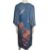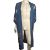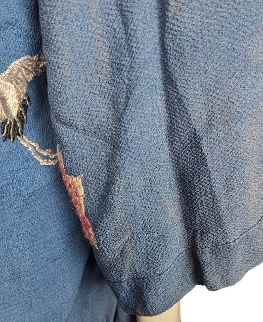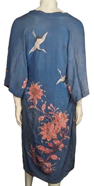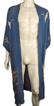 An original blue robe that was owned and worn by Mary Hopkin. It is embroidered with cranes and floral pink designs. There are belt loops but no belt is included.