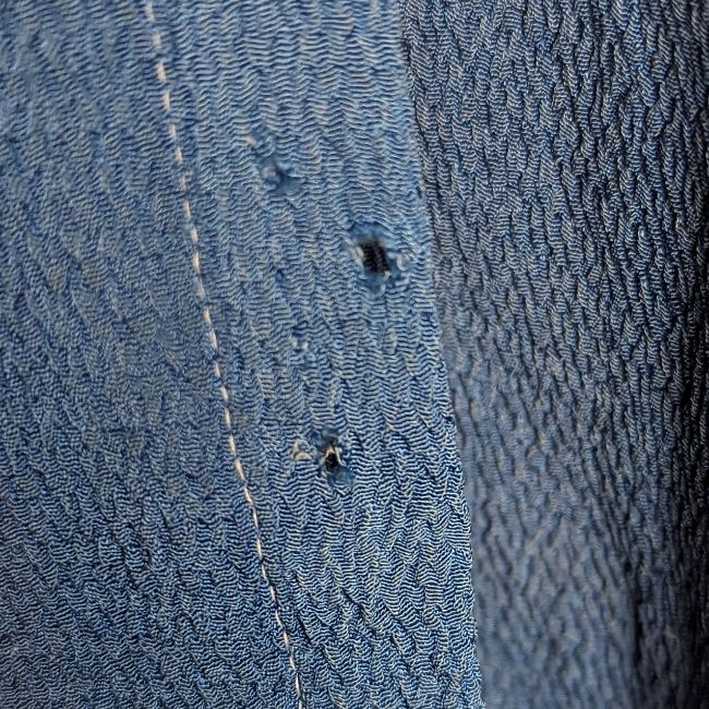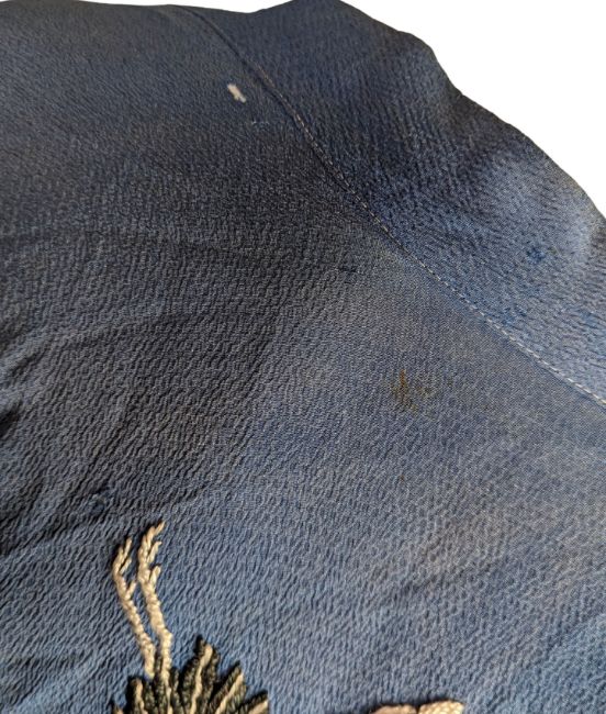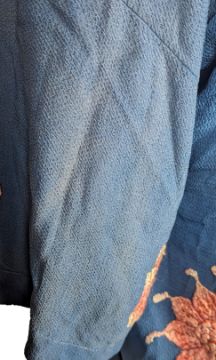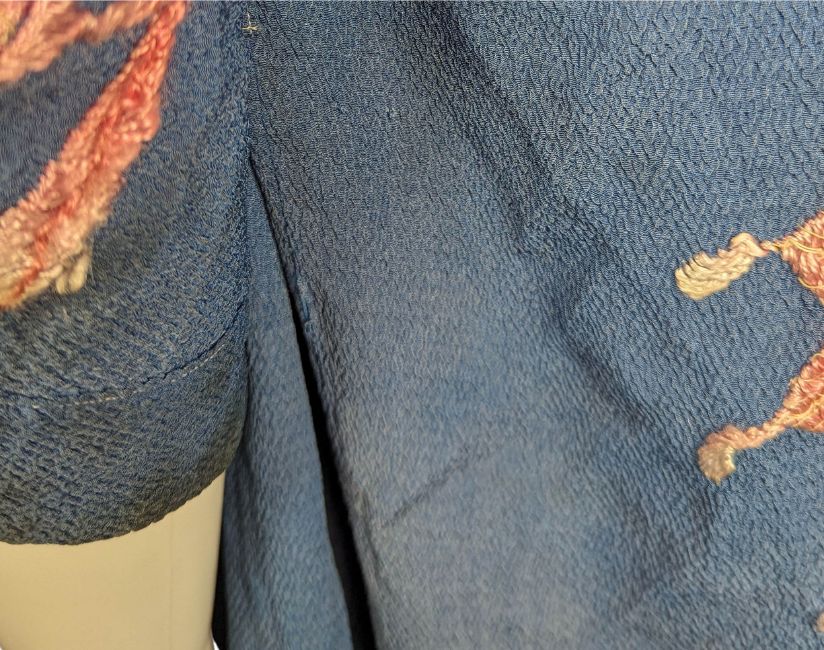 The robe measures 120cm (47.2 inches) in length and 65cm (25.5 inches) from armpit to armpit. There are several small holes in the robe, mostly around the seams of the garment. The fabric is discoloured and faded in places. The condition is very good.