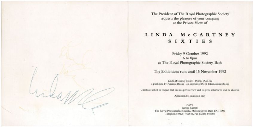 An original invitation from the Linda McCartney Sixties photographic exhibition held at The Royal Photographic Society Bath from 9th October to 15th November 1992. The invitation has been signed on the inside by Linda McCartney in blue pen. Paul has also signed but his autograph has faded to an indentation only. It comes with a photograph of Paul and Linda at the event and an unsigned invitation to the exhibition.