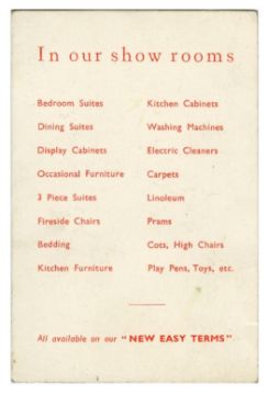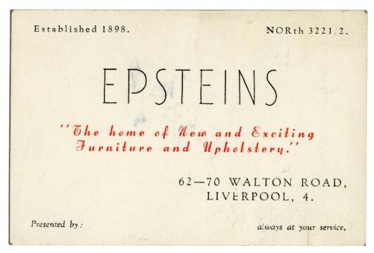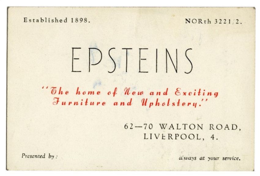 An original late 1950s/early 1960s business card for the Epstein’s Furniture Store. It bears the words ‘The home of New and Exciting Furniture and Upholstery’ along with the ’62-70 Walton Road, Liverpool, 4 address on the front. The reverse lists the items available in the store’s showrooms.