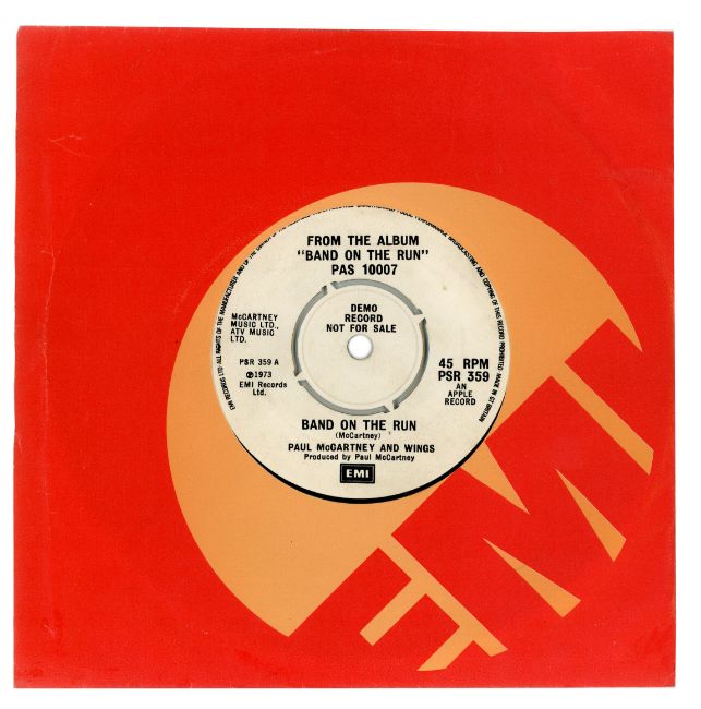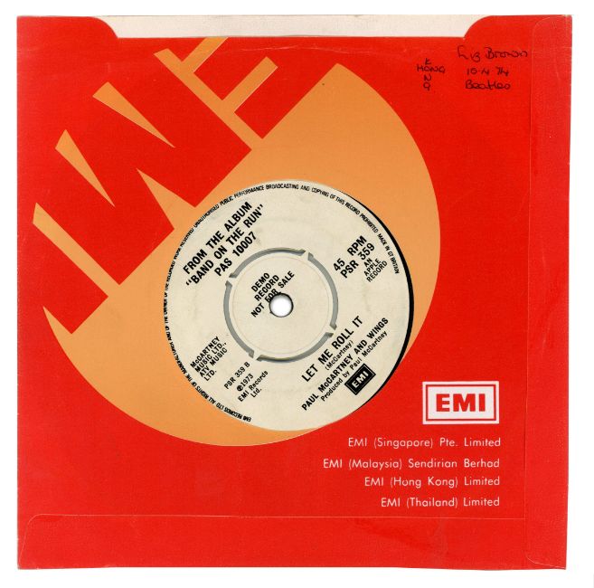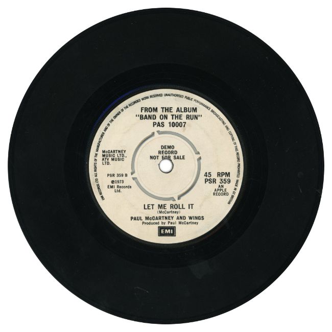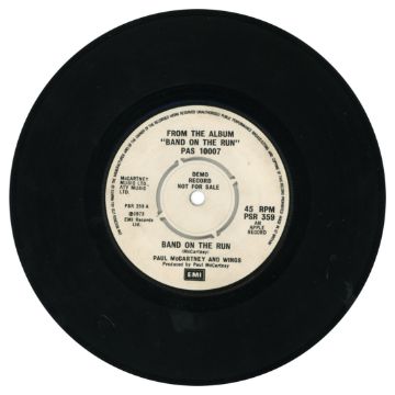 A double sided 7 inch demonstration record for ‘Band On The Run’ c/w ‘Let Me Roll It’ by Paul McCartney and Wings. This single contains a different B-side to the released version. The record is on the black and white EMI label with the catalogue number PSR 359. The matrix number on side one is PSR 359A-1. The matrix number on side two is PSR 359 B-1, 1G stampers, KT tax code.