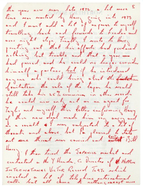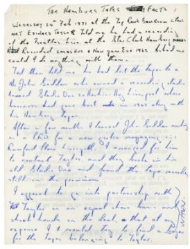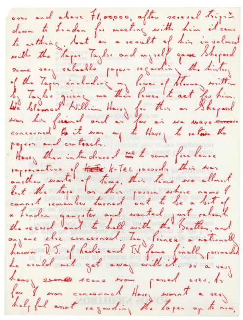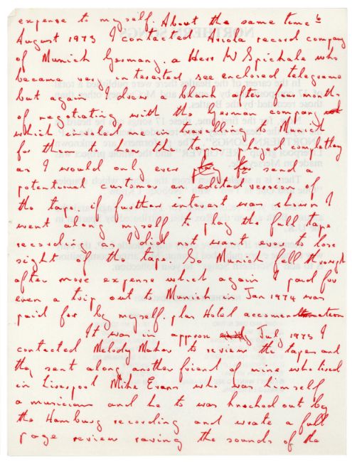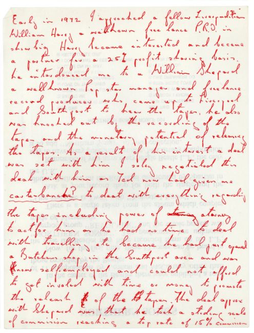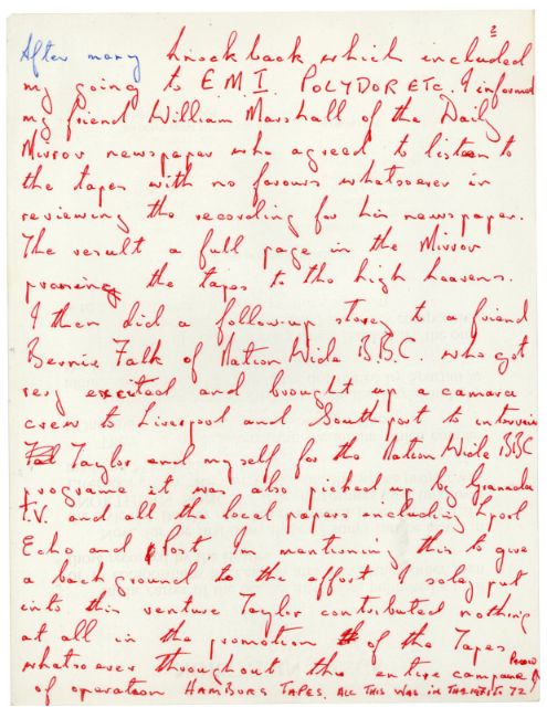 A 32 page handwritten statement by Allan Williams, The Beatles first booking agent and manager, concerning the Hamburg tapes. Each page has been written on the reverse of a press release for ‘Northern Songs (The Lennon and McCartney Compositions The Beatles Never Issued)’. The statement is titled ‘The Hamburg Tapes Facts’. Allan lists numerous facts relating to the release and subsequent court case regarding the 1977 LP ‘The Beatles Live At The Star Club In Hamburg Germany 1962’.