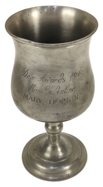 An original Disc Award presented to Mary Hopkin as the winner of the paper's Miss Valentine in 1971. The cast pewter goblet is engraved with the award details along with Mary’s name.