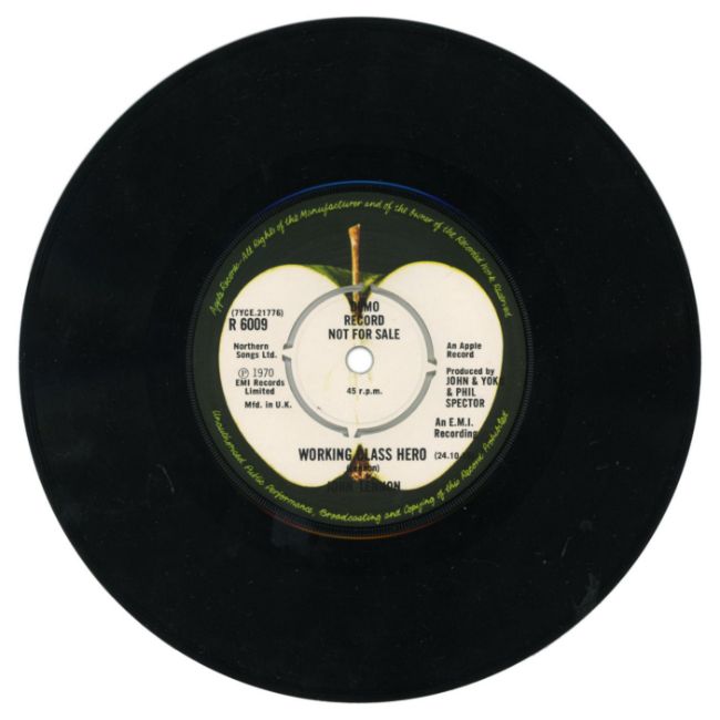 A double sided 7 inch demonstration record for ‘Imagine’ c/w ‘Working Class Hero’ by John Lennon. The record is on the Apple label with the catalogue number R6009. The matrix number on side one is 7YCE 21775-1, 1G stampers. The matrix number on side two is 7YCE 21776-1, 2A stampers. The record was released in the UK on 24th October 1975.