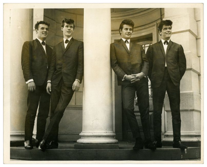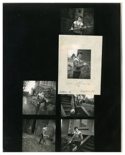 A sixties contact sheet containing six black and white images of Pete Best taken outside of 8 Haymans Green, Liverpool - home of the famous Casbah Coffee Club. One of the images has a paper border stuck down over the front of it with ‘1 13/16 April 11 Marilyn’ handwritten in pencil. The contact sheet comes with a sixties black and white promotional photograph of The Pete Best Four.