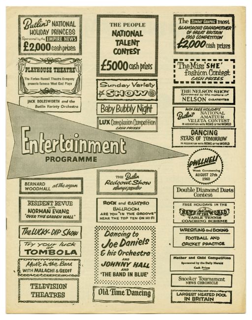 An original entertainment programme for Butlin’s Pwllheli holiday camp for the week commencing 27th August 1960 to 2nd September 1960. It advertises Rory Storm and The Hurricanes performances, with Ringo Starr on drums, on various dates throughout this period.