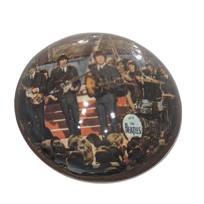 An unofficial sixties super rare glass paperweight featuring a colour image of the Beatles performing on stage.