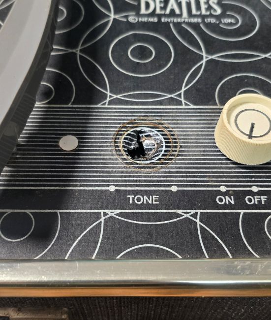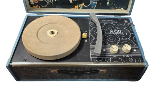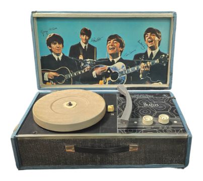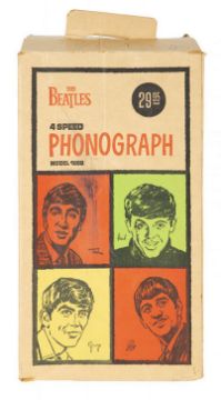An original 1964 Beatles record player and original card box licensed by NEMS Enterprises Ltd and made in a limited edition of just 5,000 in the USA. The record player comes with the original cardboard box which features head and shoulder sketches of each Beatle on a colour background.