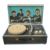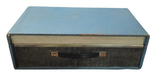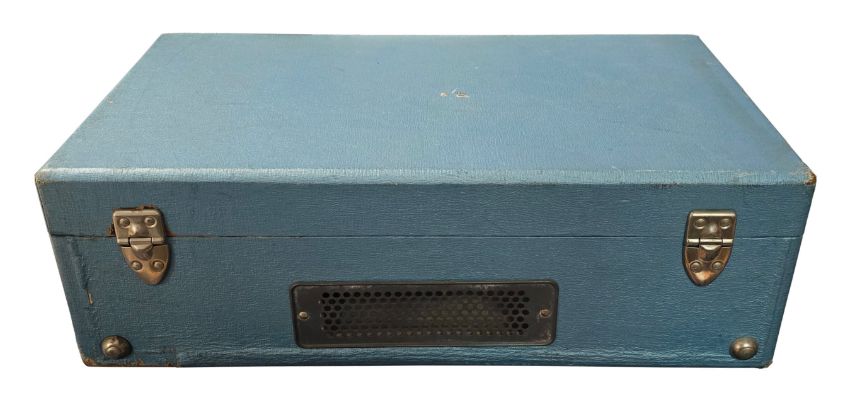 The record player measures 44.5cm x 25.5cm x 14cm x (17.5 inches x 10 inches x 5.5 inches). The large colour sticker usually on the outside is missing although this may not have been originally applied to it during the manufacturing process. The original plastic turntable has been replaced with a metal one and the tone switch has become detached. There are numerous areas of scuffing to the box resulting in the blue coating being removed and the wood being exposed. There is wear to the corners and edges of the case with some rusting to the clasps. The condition is good. The box measures 51cm x 29.5cm x 18cm (20 inches x 11.75 inches x 7 inches). There are is scribbling in coloured pencil to two sides of the box , some scuffing to one side and various small scuff marks to the edges and corners. The condition is very good minus.