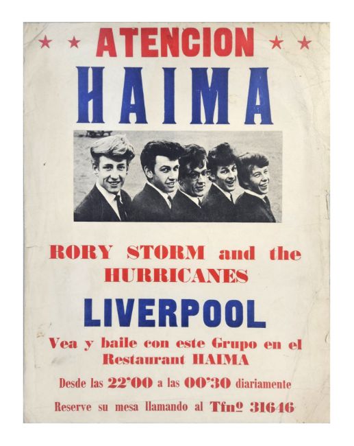 An original card concert billboard poster promoting a performance by Rory Storm and The Hurricanes at the Restaurant Haima, Spain circa 1964.