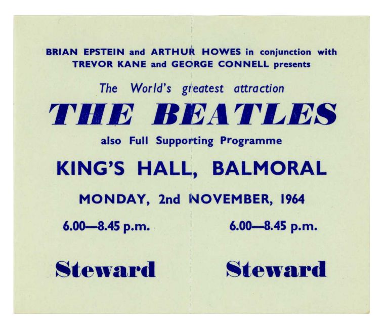 An original complete unused Steward ticket for The Beatles performance that took place at King’s Hall, Balmoral, Belfast on 2nd November 1964.